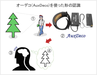 額でものを見る。その言葉が何を意味するのか、すぐに理解できる人は殆どいないでしょう。たとえば、指先で触れることで文字を読む点字。いうなればこちらは、指の触覚を使い、ある種の記号を“読む”ということ。対して“額でものを見る” 「オーデコ(AuxDeco)」とは、カメラで捉えた映像の輪郭を電気信号に変え、その情報を額の触覚で読み取るシステムをいいます。