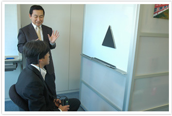 今でも忘れられないのは、ある先天盲の青年がテストをした時のこと。最初、縦に棒を1本貼り付けると難なく彼は言い当てました。次にそれを横にすると『あ、棒を傾けましたね。今度は横です』。さらに棒を2本にしたり、十字においてみたりしましたが、彼は次々に当てるんです。今度は三角のパネルを置きましたが、これを認識するのはかなり難しい。少し時間はかかりましたが、しばらくして彼の口から出た言葉が 『僕、見えます。三角形です!』。だって彼は先天盲であり、 “見る”という経験をしたことがないんです。そんな彼の口から 『見える』という言葉が出た。それはもう、感激しました。自分がこれまでやってきたことは、間違いではなかった。本当の意味で僕に自信を持たせてくれたのが、その青年の『見え る』という言葉だったのです」