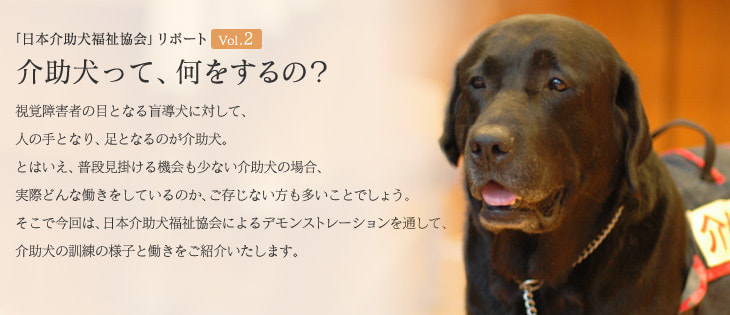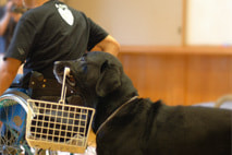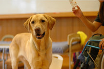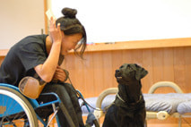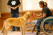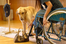 2歳の女の子のメリーは、3頭のなかで一番の新人。現在は車いすの段差介助、床に落ちたものを拾い上げて手元におく介助、バックなどをくわえて運びながら付いてくる訓練などをしています。なかでも、落ちたものを拾う、という動作は、肢体不自由者の方が絶対に必要とする動作。介助動作の訓練では、基本中の基本なのだそう。
