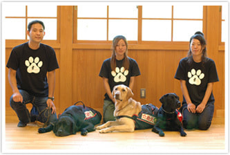 左側は、トレーナー歴8年の植松さんと8歳になる介助指導犬ウィリーのベテランコンビ。植松さんは介助犬の育成と共に、アシスタントトレーナーのコーチも担当。パートナーであるウィリーもまた、訓練中の介助犬のお手本となる頼もしい存在です。