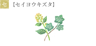 ヨーロッパや西アジア、北米などに自生する蔦植物で、日本でも観葉植物のアイビーとして知られています。古代ギリシャでは酒神デュオニソスに奉る聖木であり、常緑であることから不死の象徴ともされてきました。キヅタの葉から抽出されるエキスには、サポニンやフラボノイドが含まれ、抗炎症作用や収れん作用、痩身作用などが期待され、化粧品の他にボディケア製品にも用いられます。