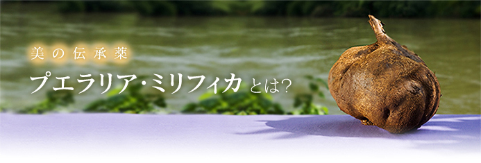 プエラリア・ミリフィカとは、ミャンマーとの国境に近いタイ北部の山岳地帯に自生するマメ科クズ属の植物。地中には30㎏にも及ぶ大きな塊根(いも状の根)をいくつも作ります。山岳地帯で暮らすモン族の人々は、古くからこのプエラリアの塊根部を、若さと健康を保つ民間伝承薬として珍重し、健康食としても用いてきたといいます。